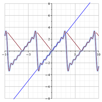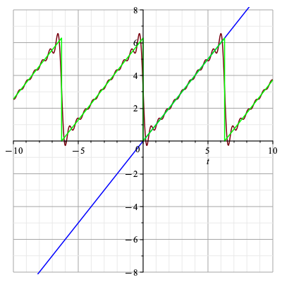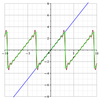 As a consequence of the above theorem, if \(g\in C[-\pi, \pi]\) and has continuous derivative on \(C[-\pi, \pi]\text{,}\) we can redefine \(g(-\pi)\) to be \(g(\pi)\) and extend this function to be a \(2\pi\) periodic function on \(\bbR\text{.}\) Then the resulting function satisfies the assumption of the above theorem at any \(x\) such that \(-\pi \lt x \lt \pi\text{,}\) so \(S_N[g]( x)\to g(x)\) as \(N\to \infty\text{.}\) At \(x=\pi\text{,}\) the left limit of the extended function is \(g(\pi)\) and the right limit of the extended function is \(g(-\pi)\text{.}\) Thus \(S_N[g]( \pi)\to \frac{g(\pi)+g(-\pi)}{2}\) as \(N\to \infty\text{.}\) Since the Fourier series expansion here is \(2\pi\) periodic, the proper interpretation of the expansion is that the series equals the \(2\pi\) periodic extension of the given function on \((-\pi, \pi]\) in the above sense.